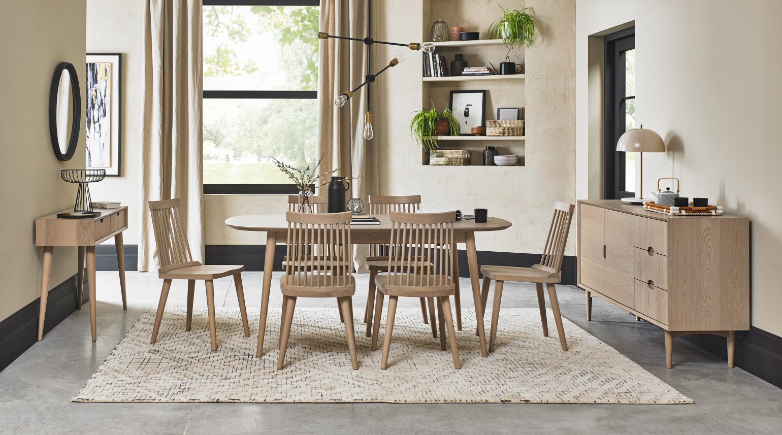 Lighting plays a key role here. A well-placed pendant or wall light creates visual height and anchors the space. Similarly, sheer curtains mounted close to the ceiling draw the eye upward and soften incoming light, adding to the sense of openness. Där Lighting offers a wide range of stylish pendants, glass shades and soft industrial looks that work beautifully in dining areas.