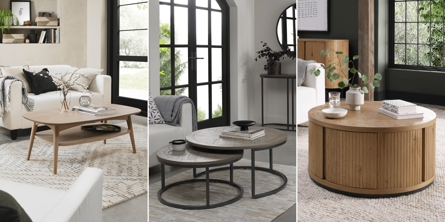 Our coffee tables feature refined finishes such as rustic oak and peppercorn, grey-oiled oak, and other carefully considered materials. When styling, echo these tones in your accessories to create a cohesive and balanced look that feels connected to the furniture beneath.