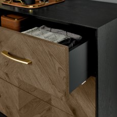The Morreto Fumed Oak & Peppercorn 3 Drawer Chest blends mid-century elegance with modern sophistication. Featuring rustic oak veneers in a rich fumed oak finish framed by wire-brushed peppercorn accents, it showcases a distinctive chevron pattern and sleek detailing that bring warmth and texture to contemporary bedrooms.